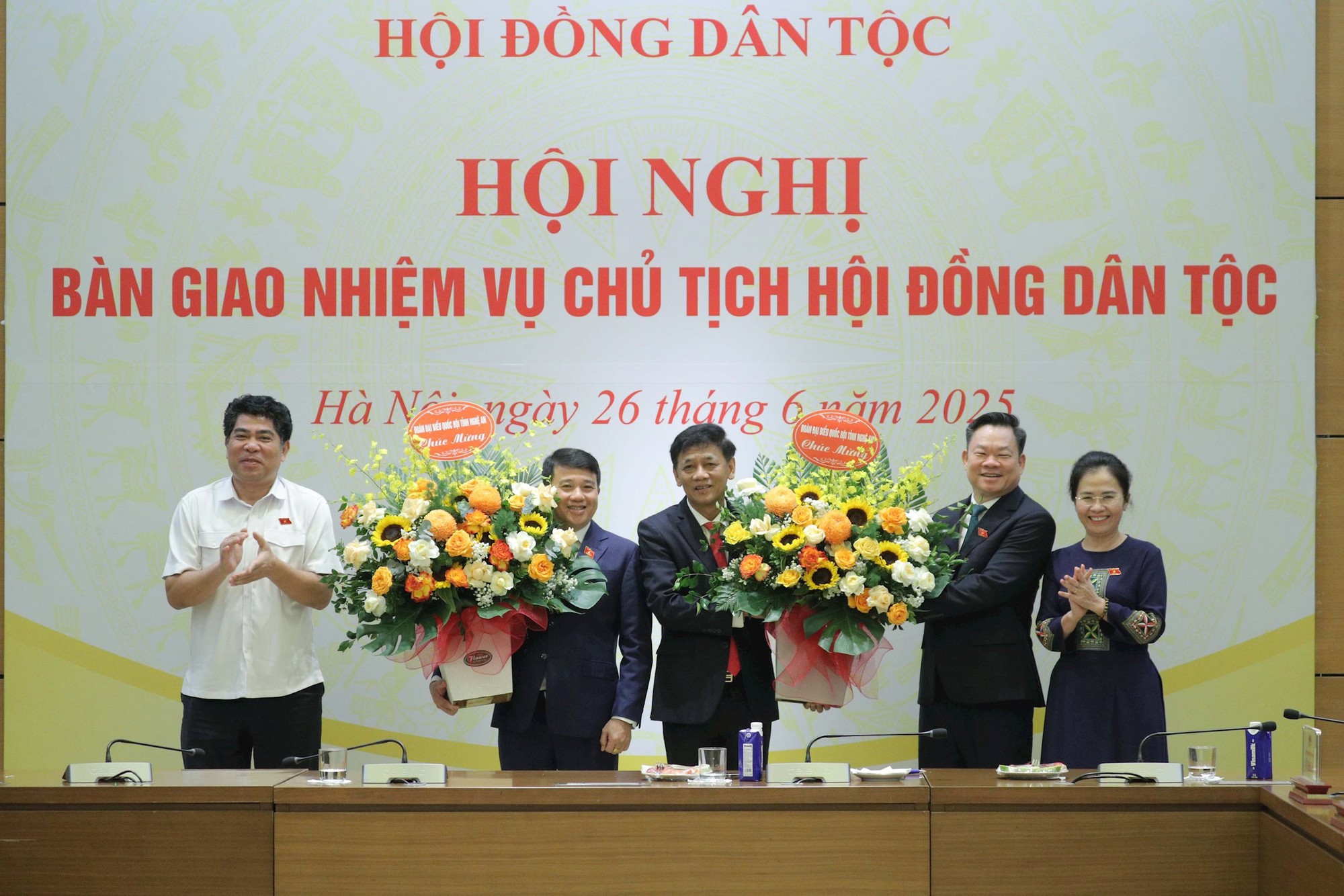 Phó Chủ tịch Quốc hội Vũ Hồng Thanh tặng hoa chúc mừng đồng chí Y Thanh Hà Niê Kđăm nhận nhiệm vụ mới; chúc mừng tân Chủ tịch Hội đồng Dân tộc Lâm Văn Mẫn, tân Phó Chủ tịch Thường trực Hội đồng Dân tộc Hoàng Duy Chinh.