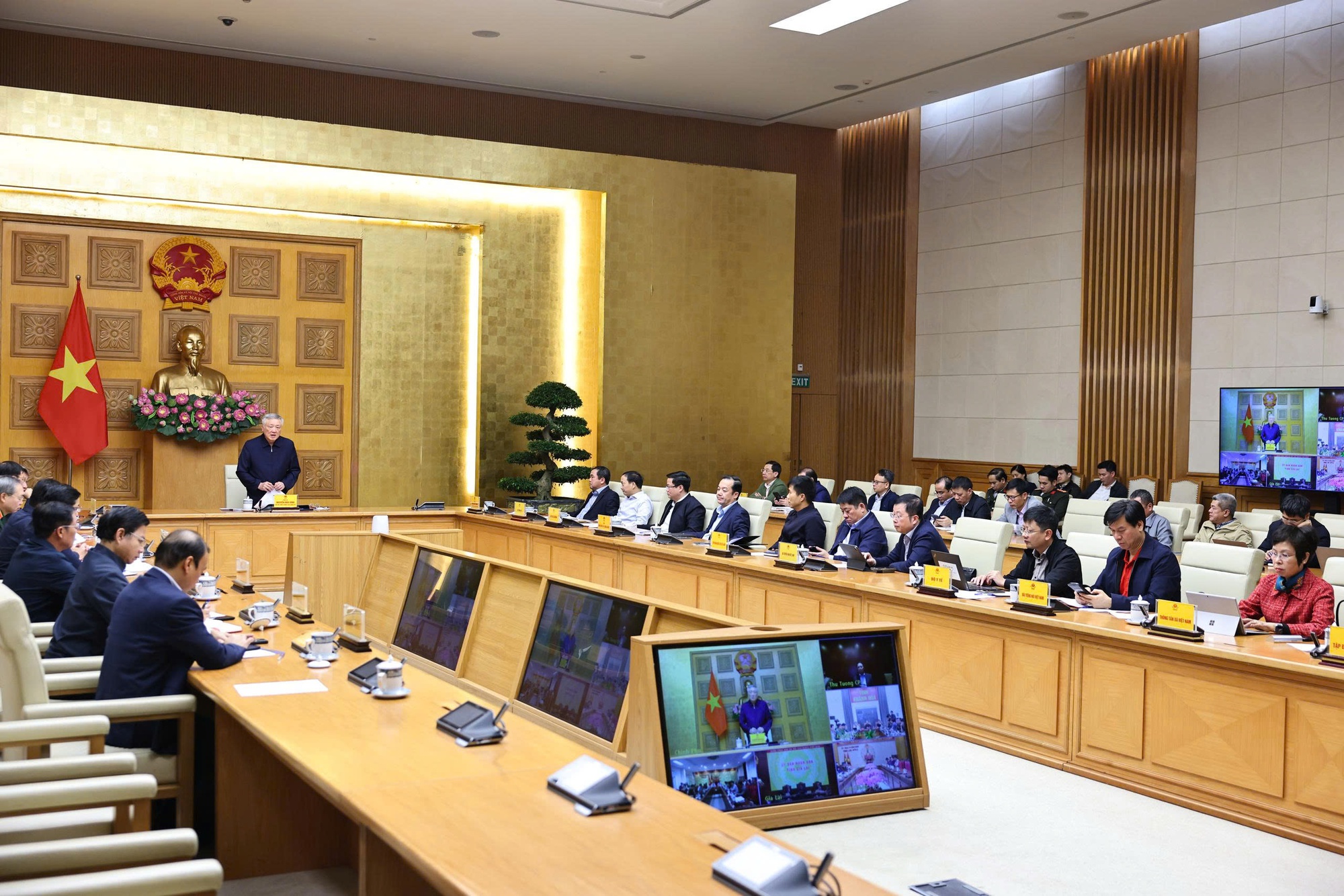 Phó Thủ tướng Thường trực Chính phủ Nguyễn Hòa Bình dự tại điểm cầu trụ sở Chính phủ - Ảnh VGP/Đình Hải